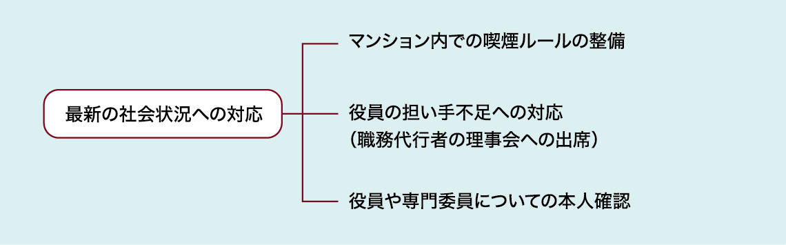 また管理規約は、最新の社会状況に対応し、ルールをアップデートしておくことも必要になります。今般の規約改正では、改正法との整合性を確保するだけではなく、これに加えて最新の社会情勢に対応する仕組みも設けました(図表①)。
