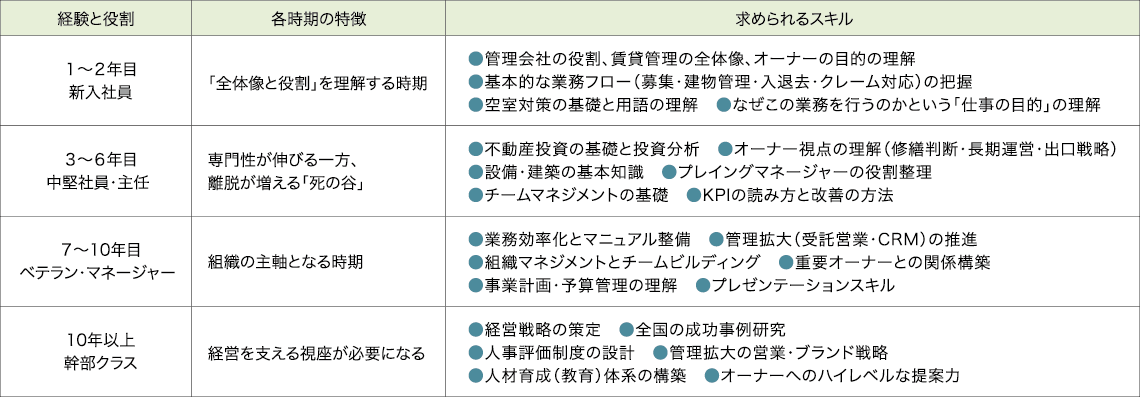 中堅社員には、不動産投資としての賃貸経営の視点や利回りの考え方、修繕判断や出口戦略などのオーナー視点を理解してもらいます。また、設備や建築に関する基礎知識、KPIの読み方と改善策、小さなチームを動かすマネジメントの考え方などもこの時期に求められる能力です。「専門性」と「小さなマネジメント」の両方が伸びる時期であり、この層が育つかどうかが、会社の中核をつくる重要な分岐点になります。