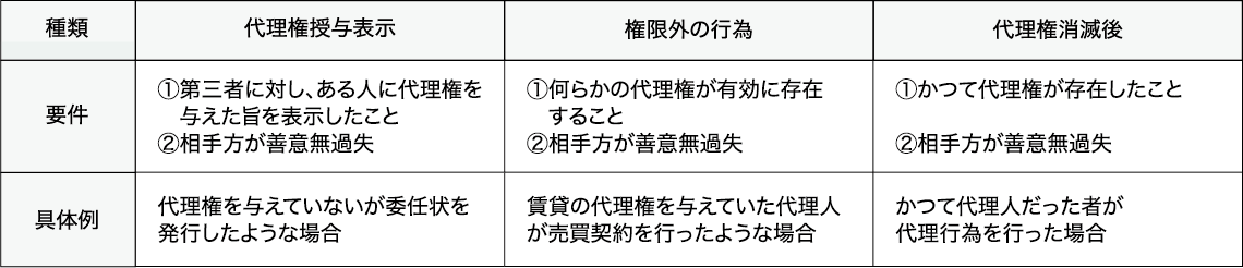 無権代理行為であっても、下記のように、本人と無権代理人との間に特殊の関係があるため、代理権が存在するように見える場合は、本人について代理権が真実存在すると同様の効果(本人への効果帰属)が認められます。なお、代理権授与表示による表見代理と権限外の行為の表見代理をプラスしたパターン(賃貸の代理権を授与する表示で売買をしたような場合)や、代理権消滅後の表見代理と権限外の行為の表見代理をプラスしたパターン(賃貸の代理権が消滅した後に売買をしたような場合)の表見代理も認められます。
